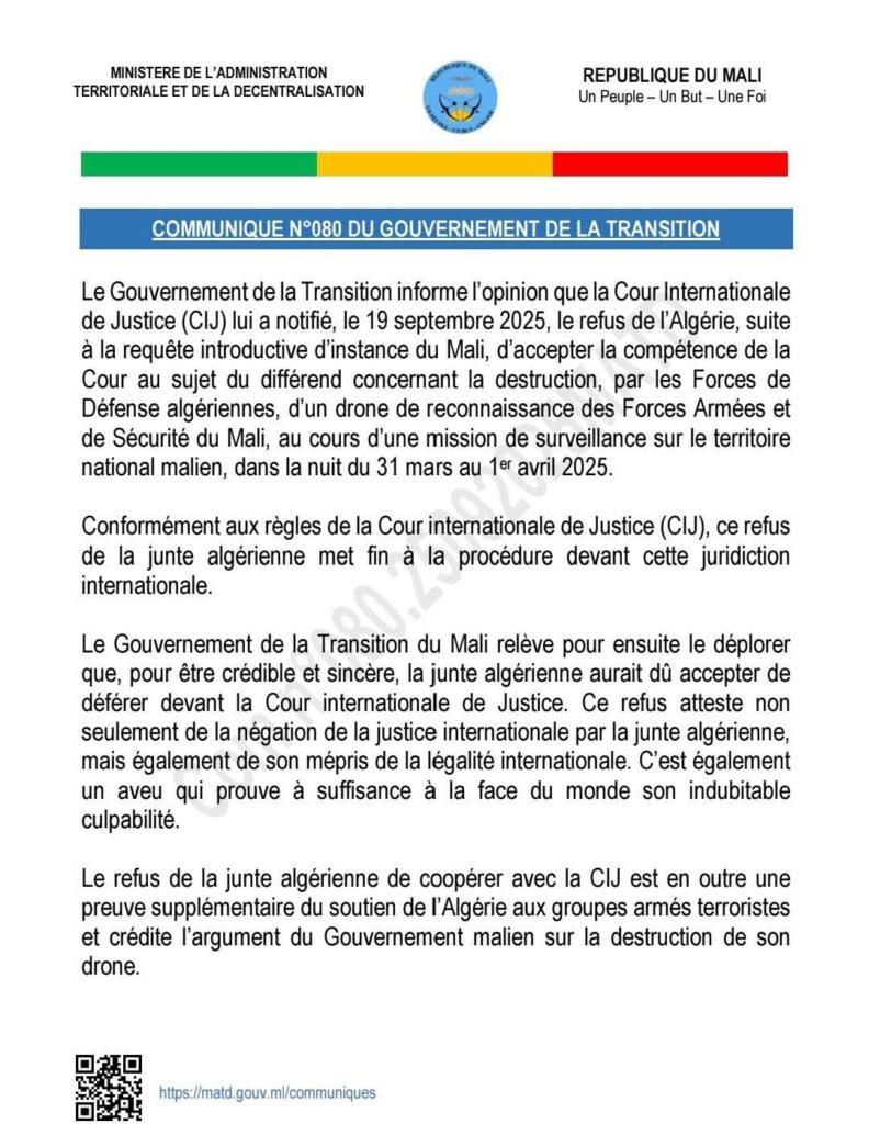 أعلنت مالي أن الجزائر رفضت “المثول أمام محكمة العدل الدولية” في قضية تدمير مسيّرة تابعة للجيش المالي، مضيفة أن ذلك “دليل إضافي” على دعمها “الجماعات الإرهابية المسلحة، ويُضفي مصداقية على حجة الحكومة المالية” بشأن تدمير الطائرة.